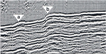 Unter Ausnutzung der Beziehung, die zwischen Reflexionszeit und Delay-Zeit besteht, wurde nun in Richtung des Streuers eine Zeitmigration durchgeführt, deren Ergebnis auf der rechten Seite der Abbildung zu sehen ist. Hierdurch wird ein wahres Bild von den Untergrundverhältnissen unter der Spurlinie des Streuers vermittelt, also dort, wo die zum Streuer gehörenden Refraktionsstrahlen den Refraktionshorizont verlassen. Offenbar tritt nach der Migration der Störungscharakter der zwei mit a und b bezeichneten Bereiche nunmehr deutlich hervor. Diese Weiterentwicklung der Migration dürfte dann besonders wertvoll sein, wenn im Streichen des Refraktionshorizontes Linien und senkrecht dazu Streuer geschossen werden. |