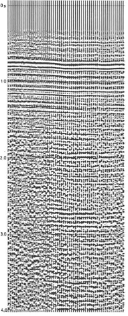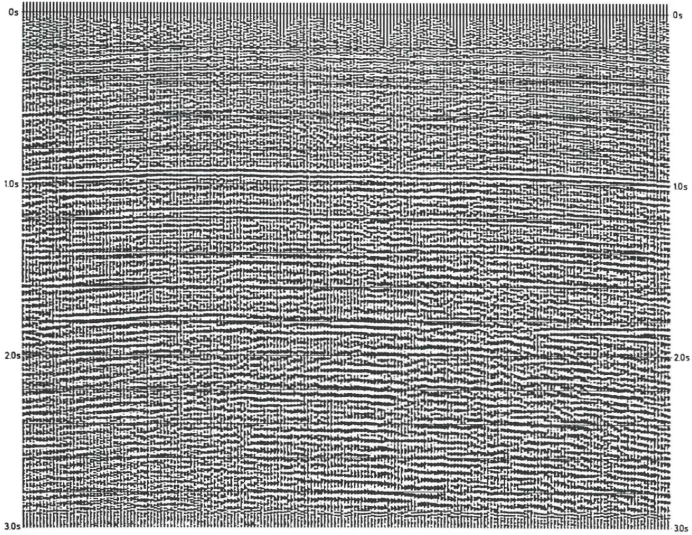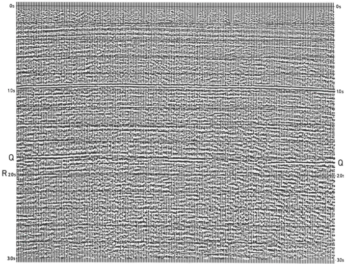 One only needs, therefore, remove all other events wh ich are contained in the auto-correlation and which do not belong to the seismogram, to get a seismogram trace in which the zero level lies accurately at the time of the back-reflecting surface of the earth. With this, the first difficulty is removed; to solve the second one we deconvolve the original trace before auto-correlation with an operator of short to medium length. The autocorrelation is then nearly aspike trace. The autocorrelation so processed and then convolved with the original trace results in the rough multiple trace. This will still be weigthed in a well-known manner so that the energy of the resulting trace (trace minus multiple trace) becomes aminimum. This weighting can be performed either at a constant rate or be made time-variant. Fig. 1 shows in the centre below approximately 1.5 s numerous strong reflections. After applying the LLMA process (fig. 2) these reflections nearly disappear altogether. Actually, those were multiple reflections which could not be attenuated as the upwardly concave curvature of the upper horizons causes near coincidence of moveout times of the multiple reflections with those of the primary reflections. In figure 3 the maximum shot-geophone spacing was too small to attenuate multiple reflections beneath 1 s by multiple coverage. Figure 4 shows that the application of the LLMA process brings forth Horizon Q distinctly and below Q, Horizon R becomes visible as weil. |