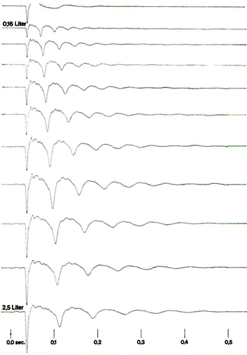 Fig. 1 Signalformen von Luftpulsern verschiedener Volumina Signatures of airguns with different volumes ![]()