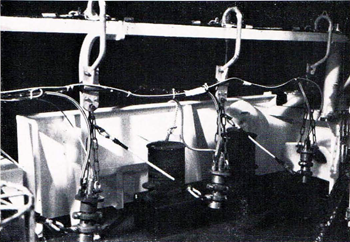 Howsoever the bubble effects are controlied, the initial pressure pulse amplitude of the array must not be reduced. On the contrary, provisions must be made to increase the pressure pulse amplitude. It seems to be obvious that an increase of the total volume of the array might be a simple way to achieve this. It is a weli-known fact, that the peak pressure of a dynamite charge does not increase proportional to the charge weight. ![]() Ausgefahrenes Array während der Messung The Two-Chaine-Array during the survey A similar relation holds for airguns: ![]() α is about ½ for a certain type of guns. To overcome the limitations imposed by the square root law, volumes are usually subdivided and distributed over a larger area. By this, a relation ![]() can be achieved. To harvest the full potential of an airgun array with increased volume, the individual guns must be therefore distributed over a larger area. The size of the survey boat imposes stringent limits to the handling and towing of far spread out airguns. The peak pressure achieved with a certain air volume can be the larger the better the relation (4) is approximated. In practice, the airguns are stringed up on. chaines as shown in fig. 2. An array with about 30 liters volume per shot, spread over an area of about 400 m² was built up for RN PROSPECTA and RN EXPLORA. This array consists of two chaines towed on starboard and on port respectively. The guns are held at a predetermined depth with the aid of surface floats. Maximum length of one chain is about thirty meters (Fig. 3). The chain array was tested in deep water. Fig. 4 shows the broad-band recording of the outgoing signal. The array has been put into operation for production work and has proved to meet the rigorous demands of the operating crews and of the exploration geophysicists. |