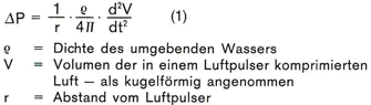 Hohe Energieabstrahlung ist immer noch eine der wichtigsten Forderungen für eine Energiequelle in der Seeseismik. Außerdem sind ein gut gesteuerter Frequenzinhalt und absolute Reproduzierbarkeit der Signalform Voraussetzungen für ein modernes Processing der Meßdaten. Luftpulser-Arrays haben in vieler Hinsicht günstige Eigenschaften. Sie erzeugen starke und gut definierte Druckimpulse bei schneller Schußfolge. Die an Bord gespeicherte Energieform ist lediglich komprimierte Luft, die heutzutage kaum ein Sicherheitsrisiko für die Besatzung bedeutet. Bei den Kontraktoren gibt es jedoch beträchtliche Unterschiede in der Nutzbarmachung dieser Energiequelle. Der seismische Wirkungsgrad ist einer der Parameter, welcher in bar-Meter pro Liter komprimierter Luft, die pro Schuß abgegeben wird, angegeben werden kann. Werte von 0.75 bis 1 bar-Meter pro Liter werden als gut betrachtet. Werte bis zu 1.5 bar-Meter pro Liter können theoretisch erreicht werden. Diese Druckwerte werden in einer Entfernung gemessen, die groß ist, wenn man sie mit den Dimensionen der Luftpulser-Arrays vergleicht. In der Praxis genügt eine Entfernung von etwa 100 Metern. Die Zunahme des Druckes im Wasser, ΔP, die von der Energiequelle verursacht ist, kann nach der Bernouill'schen Gleichung für den hydraulischen Fluß im Fernfeld berechnet werden: Das Produkt aus dem Druckimpuls ΔP und der Entfernung r kann für 'eine bestimmte Energiequelle als konstant angenommen werden. Bubble-Signalformen Die Signalformen der einzelnen Luftpulser sind nicht frei von Sekundäreffekten, die auf die Wechselwirkung zwischen dem freigesetzten Luftvolumen und der Wassermasse über dem getauchten Luftpulser zurückzuführen sind. Die Oszillation der freigesetzten Luft verursacht Bubble-Impulse, deren Frequenz, außer von anderen Parametern, von dem Kammervolumen des Luftpulsers abhängt. Die Periode der Bubble-Impulse ist: Die in der Gleichung (2) vorkommenden Größen haben folgende Bedeutung: Pc = Kammerdruck in bar, Vc Kammervolumen in Litern, Po = hydrostatischer Druck in bar. Figur 1 zeigt Signalformen von Luftpulsern, die ein Volumen von 0.16 bis 2.5 Litern haben. Eine wohlbekannte Technik der Bubble-Unterdrückung ist die Addition der Signalformen von Luftpulsern, die verschiedene Bubble-Perioden haben. Die oberste Signalform in der Figur 1 ist, aus technischen Gründen in reduziertem Maßstab, das Ergebnis der Addition aller Signalformen, die darunter gezeigt sind. Die beste Bubble-Unterdrückung kann erreicht werden, wenn die einzelnen Bubble-Signalformen optimal abgestuft sind in Bezug auf Periode und Druckamplitude. Dies kann mittels verschiedener Techniken erreicht werden, z. B. durch gesteuerte Wechselwirkung von Luftpulsern oder durch das verzögerte Freisetzen von einer zusätzlichen Luftmenge in das expandierende Bubble-Volumen. |