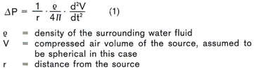 High energy is still one of the most important requirements for a marine seismic source. Besides this, weil controlled frequency content and excellent conformity of the pressure signature are prerequisites to meet the demands of modern hydrocarbon indicator processing. Airgun arrays have favorable properties in many respects. They produce strong and weil defined pressure pulses with high repetition rate. Energy stored onboard is just compressed air, which has today no serious safety bearing on the operating staff. But there are appreciable differences how contractors derive the highest benefit from this energy source. Seismic efficiency is one of these benefits, which may be expressed in bar meter per liter compressed air released per shot. Values of 0.75 to 1 bar meter per liter are regarded as satisfactory. Values of up to 1.5 bar meter per liter can be achieved theoretically. These pressure values are measured at a distance which is large compared to the dimensions of the source pattern. In practice a distance of about 100 m is sufficient. The increase of ~ressure in water, ΔP, caused by the energy source, can be calculated due to Bernoulli's equation for hydraulic flow in the far field: ![]() The amplitude of the pressure pulse ΔP multiplied by the distance r can be assumed to be constant for a certain source. Bubble signaturesSignatures of individual air guns are not free from secondary effects, resulting from the interaction of the released air volume and the water mass above the submerged gun. The oscillation of the released air produces bubble pulses whose frequency depends, among other parameters, upon the chamber volume of the gun. The period of the bubble pulses is: ![]() Fig. 1 shows signatures of guns whose volumes range from 0.16 liter to 2.5 liter. A well-known technique for bubble suppression is to add pressure signatures of guns with different bubble periods. The signature at the top of fig. 1 is, in a reduced scale, the result of the summation of the individual signatures shown. The best bubble suppression can be achieved if the individual bubble signatures are optimally graded with respect to bubble period and bubble pressure amplitude. This can be achieved by different techniques, for instance by controlled interaction of guns or by releasing a delayed surge of air into the expanding bubble volume. |