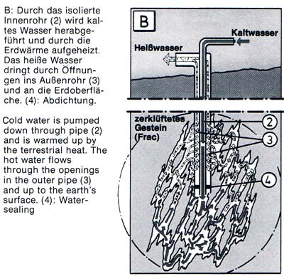 Zur Gewinnung von „trockener" Wärme brachte das US-Forschungsinstitut von Los Alamos in den JemezBergen Neu Mexikos zwei 3000 Meter tiefe Bohrungen in heißen Granit nieder. In eine davon wurde vier Tage lang kaltes Wasser unter hohem Druck eingepumpt, aus der anderen — 75 Meter davon entfernten — konnte 20 Stunden nach Beginn dieses Experimentes 150 Grad heißes Wasser mit einer thermischen Leistung von etwa fünf Megawatt entnommen werden. Damit Wasser zwischen zwei Bohrlöchern zirkulieren kann, müssen im Gestein Risse erzeugt werden. Das kann durch das sogenannte „Hydrofrac-Verfahren", das heißt durch hydraulisches Aufbrechen des Gesteins, bewerkstelligt werden. Dieses Verfahren wird bekanntlich bereits seit längerer Zeit in der Erdöl- und Erdgas-Gewinnung zur Produktionssteigerung angewandt.
