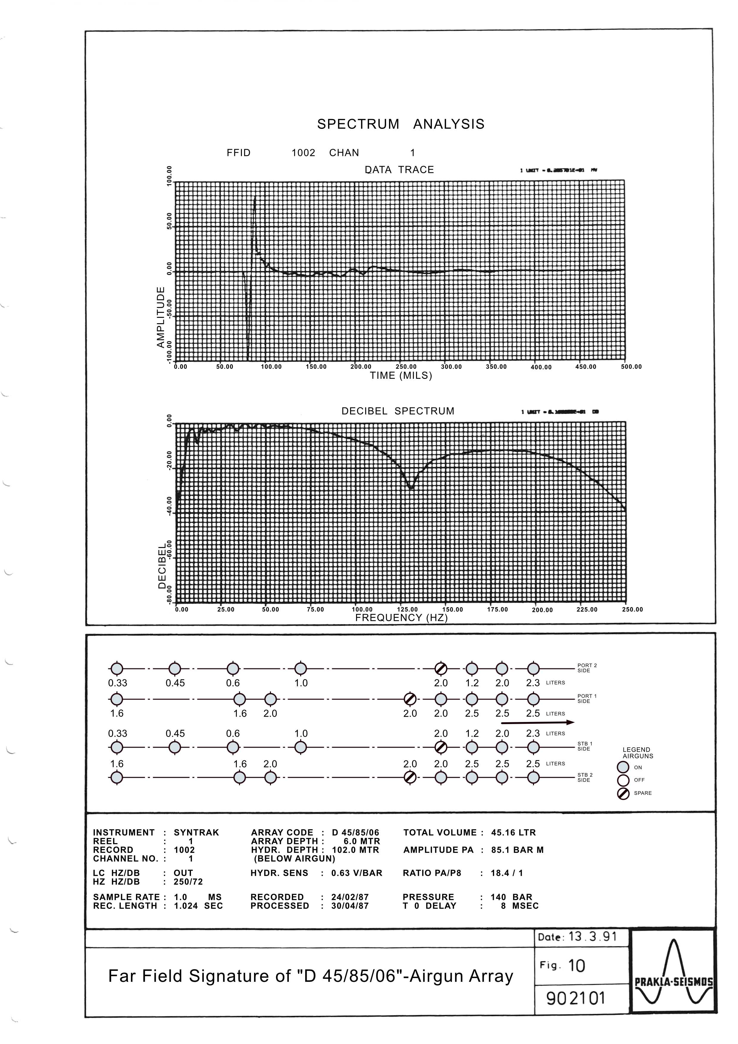 Um den Vorteil eines Luftpulser-Arrays mit vergrößertem Volumen voll ausnützen zu können, müssen deshalb die einzelnen Luftpulser über eine größere Fläche verteilt werden. Durch die Größe des Meßschiffes werden für die Handhabung und das Schleppen von weit ausgelegten Luftpulsern enge Grenzen gesetzt. Der Spitzendruck, der mit einem bestimmten Luftvolumen erreicht wird, ist umso größer, je besser die Beziehung (4) angenähert werden kann.